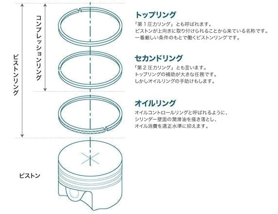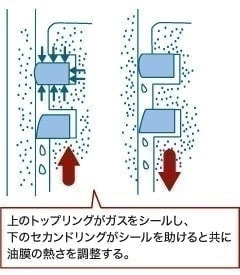 ピストンリングとシリンダーの摺動摩擦を減らすのに、オイルは欠かせないが、使い過ぎは抵抗が増し悪影響を及ぼす。ピストンリングの摺動に必要にして、最小限のオイルを確保する、重要な機能を持っている。
