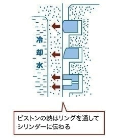 ピストンの熱を、冷却されたシリンダーの壁に逃がす。高温の燃焼ガスに接しながら、ピストンやピストンリングが安定して長寿命を確保できるのは、この熱伝導機能が効果を発揮しているからです。ピストンリングによってピストンからの熱の70%程度を放熱している。