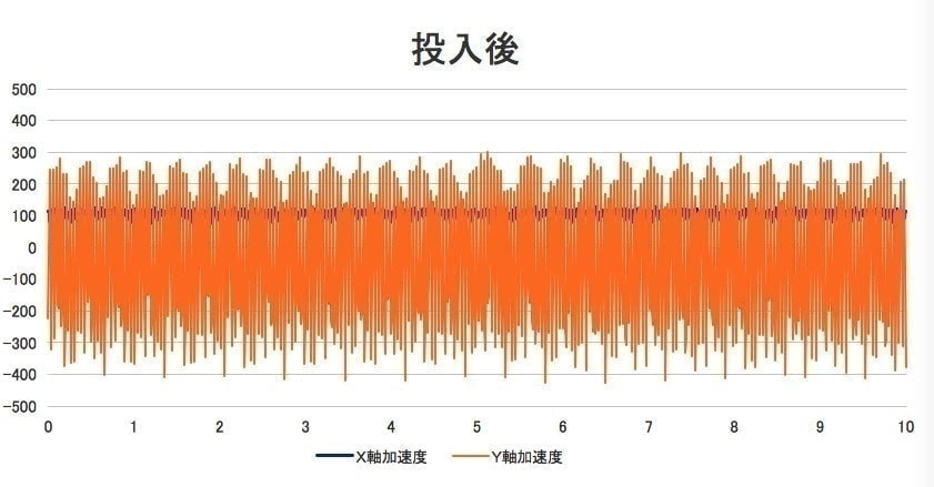 投入後は、 X軸=前後の揺れは、振動幅が極端に小さくなっている。 Y軸=左右の揺れは、振動幅は多少大きくなったが、緩やか揺れになった。 |