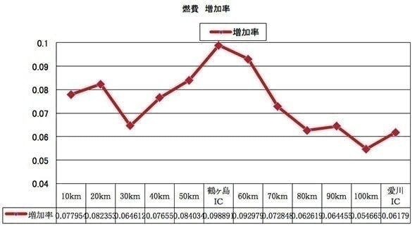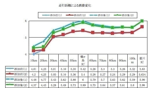 添加後は、走行中は5%~10%、最終燃費は0.35km/L 6.18%増加した。 |