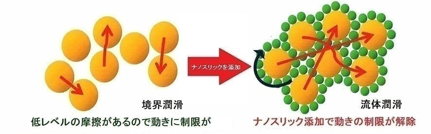 ・ナノスリックを入れることで、脆弱な油膜(境界潤滑)から、潤沢な油膜(流体潤滑)に変化する。