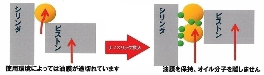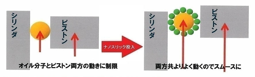 ・金属面の微細な凹凸面にも、ナノ分子が入り込むため、摺動摩擦が減少する。