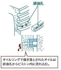 ピストンリングとシリンダーの摺動摩擦を減らすのに、オイルは欠かせないが、使い過ぎは抵抗が増し悪影響を及ぼす。ピストンリングの摺動に必要にして、最小限のオイルを確保する、重要な機能を持っている。