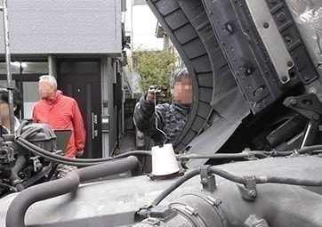 ⑧ | 必ずエンジン本体に投入する。大型トラックの場合、キャビネット正面にオイル投入口がある。そこから投入した場合、パイプが長く途中で付着しオイルパンまで届かない。 |