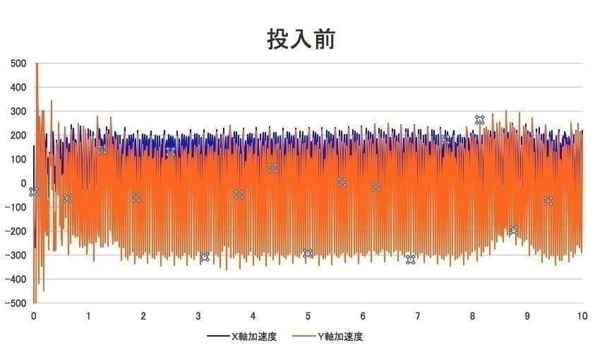 投入後は、 X軸=前後の揺れは、振動幅が極端に小さくなっている。 Y軸=左右の揺れは、振動幅は多少大きくなったが、緩やか揺れになった。 |