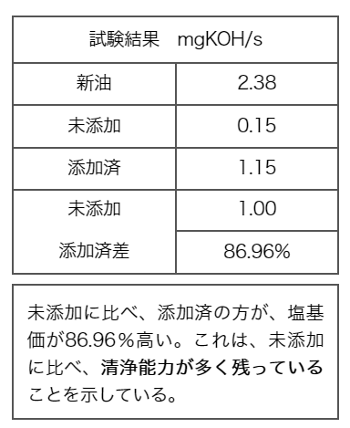 塩基価試験は、清浄分散剤の残量を確認することができる。 |